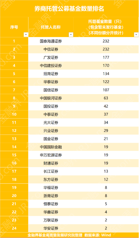证监会数据显示,目前共有30家证券公司具备基金托管资格。其中,除上述24家外,还包括国元证券、长城证券、第一创业证券等6家券商(注:海通证券已退市),托管基金数量均为0。