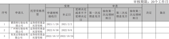 近日,证监会公布的行政许可申请受理及审核情况显示,排队申请证券基金托管资格的机构仅剩3家,其中券商仅东吴证券1家。此前排队申请的西部证券、财信证券、东兴证券、湘财证券、东北证券、渤海证券等6家券商均已撤回申请。