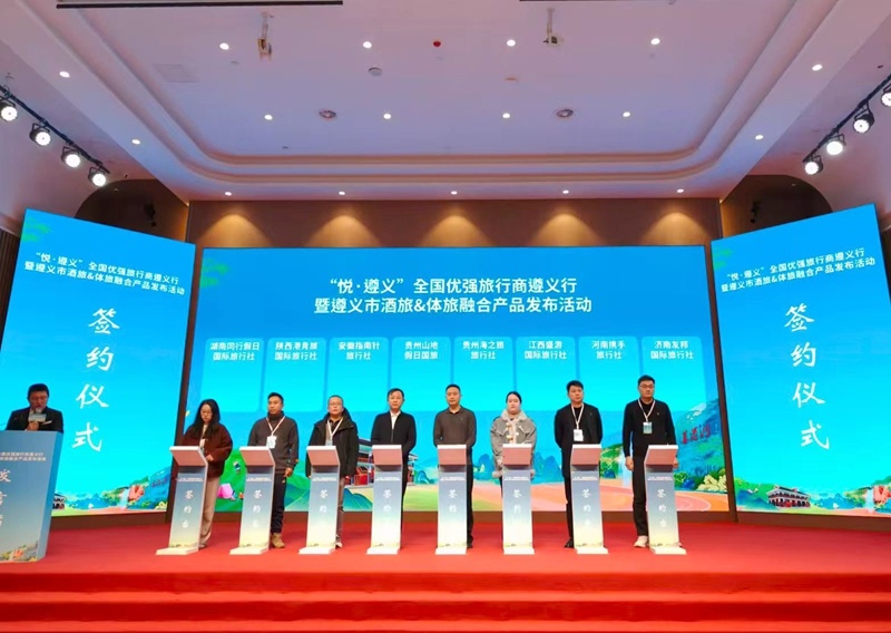 本次发布的“黔北”系列全国散拼线路产品,主要为各旅行商提供高效、匹配、可靠、高性价比的遵义落地解决方案,涵盖红色研学、酒旅探秘、体旅融合、生态观光等多个主题,为全国各地游客畅游遵义提供了多样选择。旅行商代表与遵义旅游集团签署酒旅融合航旅合作协议,2026年上半年实现协议航班切位200班次以上,推动“酒旅+航空”跨界融合;在小车小团体旅融合产品签约中,将体育赛事、景区街区与便捷服务融合,进一步提升游客便捷性和体验感。