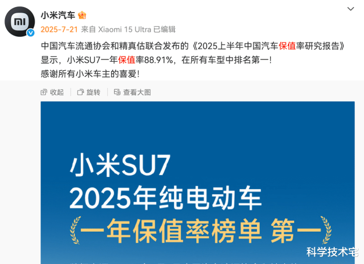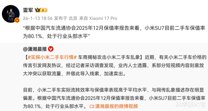 近日某平台上的二手车商攻击小米SU7保值率较低,对此小米汽车创始人、小米董事长雷军回应——根据中国汽车流通协会2025年12月保值率报告来看,小米SU7目前二手车保值率为80.1%,处于行业头部水平。
